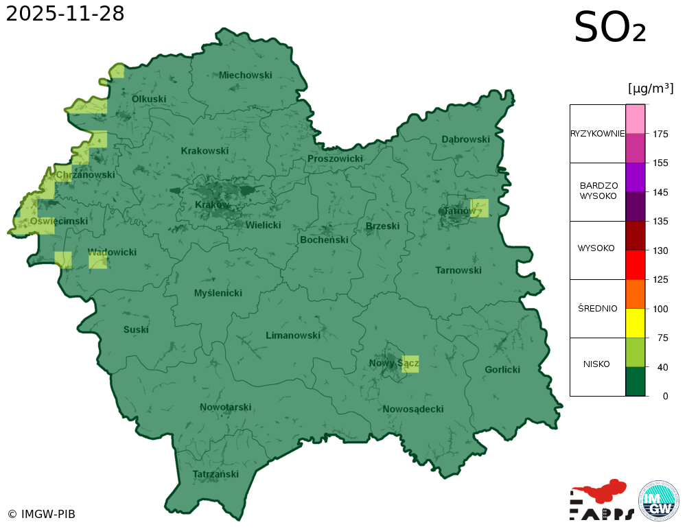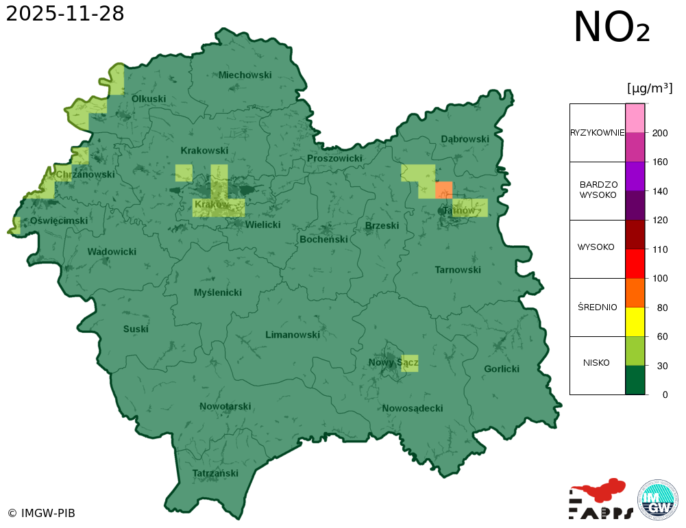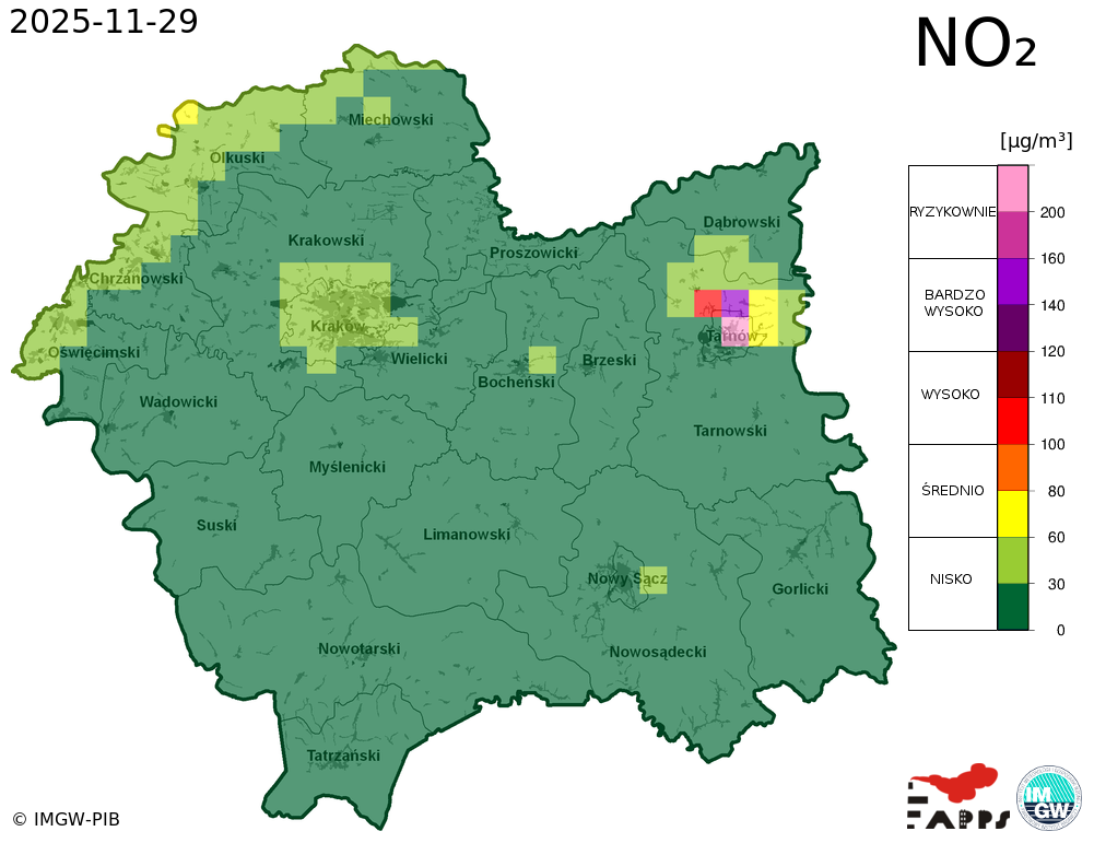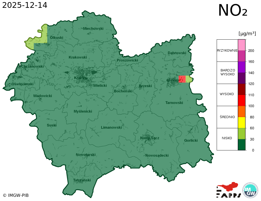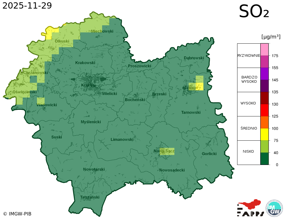 Kobiety w ciąży, dzieci i osoby starsze oraz osoby ze skłonnościami do zachorowań na stany zapalne górnych i dolnych dróg oddechowych, a także osoby z astmą i chorobami układu sercowo-naczyniowego powinny unikać przebywania na otwartym powietrzu. Zaleca się ograniczenie palenia papierosów. W przypadku pogorszenia stanu zdrowia należy skontaktować się z lekarzem. |